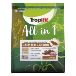 • Tropifit All in 1 Hamster & Gerbil to w pełni ekstrudowana karma dla chomików i myszoskoczków, oparta na ziarnach zbóż i nasionach, z białkiem zwierzęcym i chityną