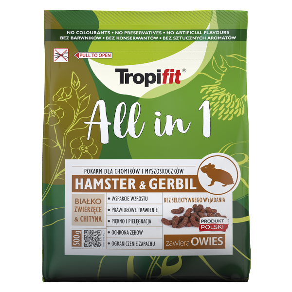 Tropifit All in 1 Hamster & Gerbil to w pełni ekstrudowana karma dla chomików i myszoskoczków, oparta na ziarnach zbóż (zawiera pełnoziarnisty owiec) i nasionach, z białkiem zwierzęcym i chityną. Nie zawiera sztucznych barwników, konserwantów, wzmacniaczy smaku, dodatku cukru i aromatów
