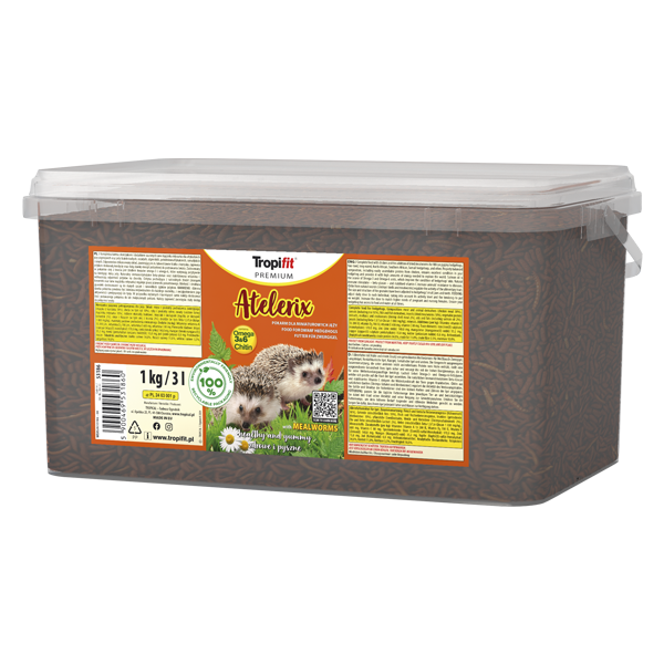 - Tropifit Premium Atelerix to pełnowartościowa karma dla jeża pigmejskiego, algierskiego, południowoafrykańskiego, somalijskiego, uszatego i innych, z kurczakiem i dodatkiem suszonych larw mącznika młynarka