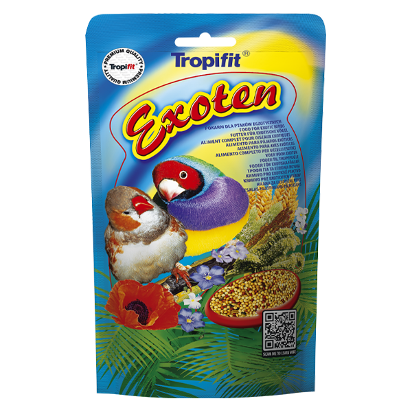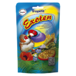 Tropifit Premium Exoten to pełnowartościowa karma dla niewielkich ziarnojadów, np.: zeberek (Taeniopygia guttata), mewek (Lonchura striata domestica), ryżowców siwych (Lonchura oryzivora), mniszek trójbarwnych (Lonchura malacca), wróbli cytrynowych (Passer luteus), srebrnodziobków (Euodice spp.) itp. Zawiera odpowiednio zbilansowaną mieszankę zbóż i nasion.