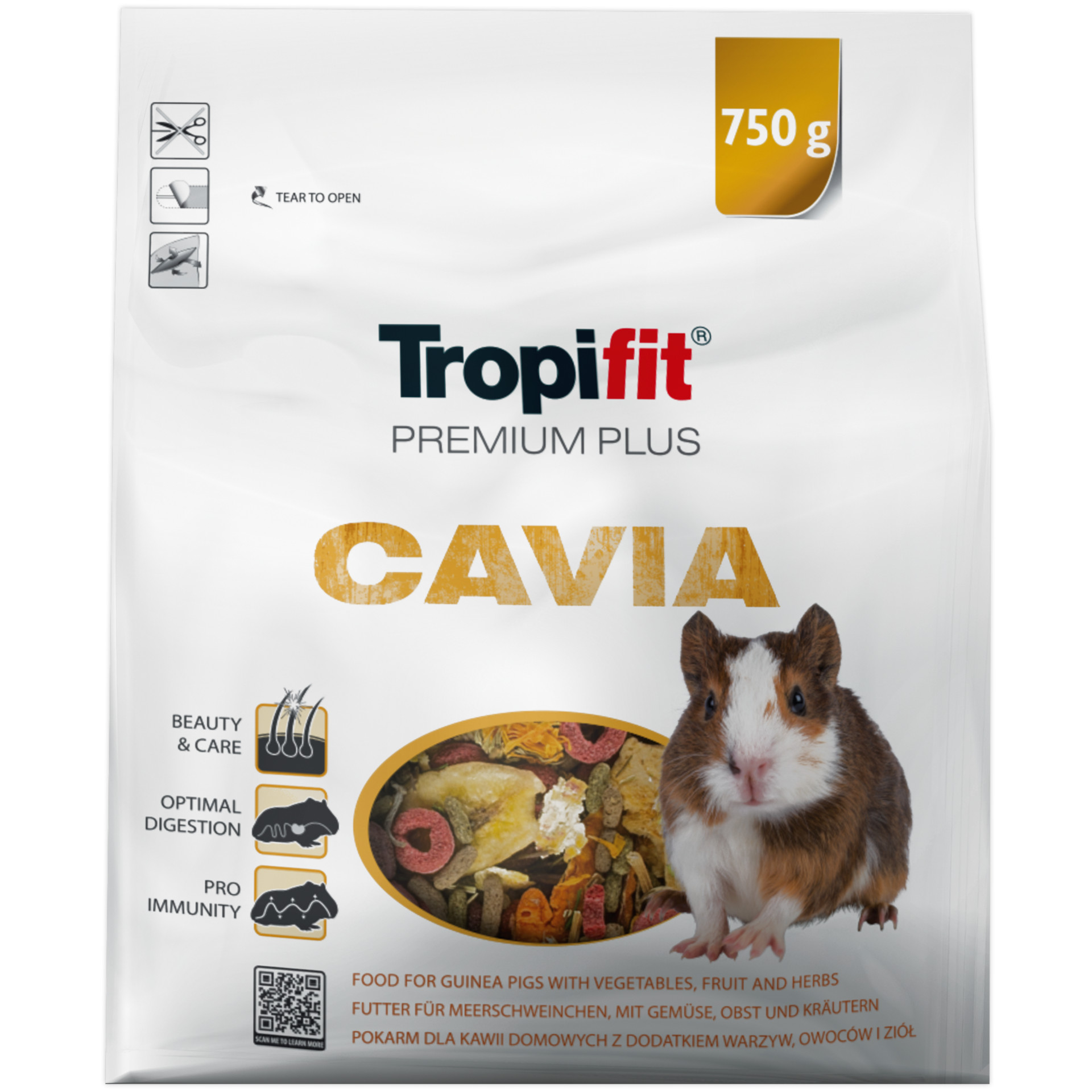 Tropifit Premium Plus Cavia to pełnowartościowa karma dla świnki morskiej (kawii domowej). Zawiera ekstrudowane granulaty z lucerną, jabłkiem i siemieniem lnianym, duże kawałki suszonych warzyw i owoców oraz aromatyczne zioła.