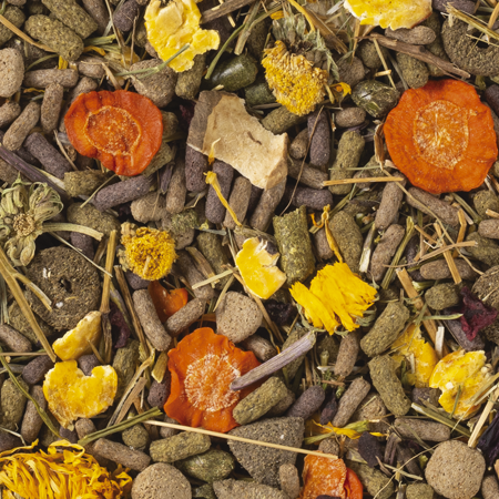 - zawiera bogate w błonnik granulaty z tymotką, lucerną, jabłkiem, siemieniem lnianym i słonecznikiem